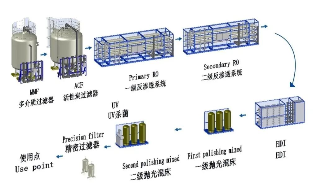 自来水进入原水箱,通过原水泵增压,经砂滤器、炭滤器、阻垢剂加药、保安过滤器,到达反渗透单元,经两级反渗透过滤进入EDI单元,达到电阻率15MΩ·cm(25℃)进入纯水水箱。纯水供水设计为循环方式,经纯水供水泵增压,通过紫外线消毒器、抛光混床Tulsimer® MB 106 UP、0.22微米过滤器接入纯水供水管,到达使用点。